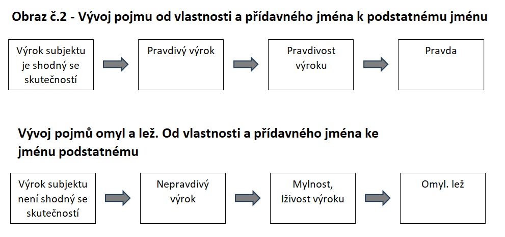 Jak se z přívlastku tvořeného přídavným jménem stalo podstatné jméno? Mylnost nebo lživost tvrzení či názoru byla původně pouze vlastností tohoto tvrzení. Vyjadřovala neshodu se skutečností, ať už neúmyslnou nebo úmyslnou. Vlastnost vyjádřená přídavným jménem se však osamostatnila a vytvořila podstatná jména – omyl, lež a pravda. Viz obrázek č. 2.