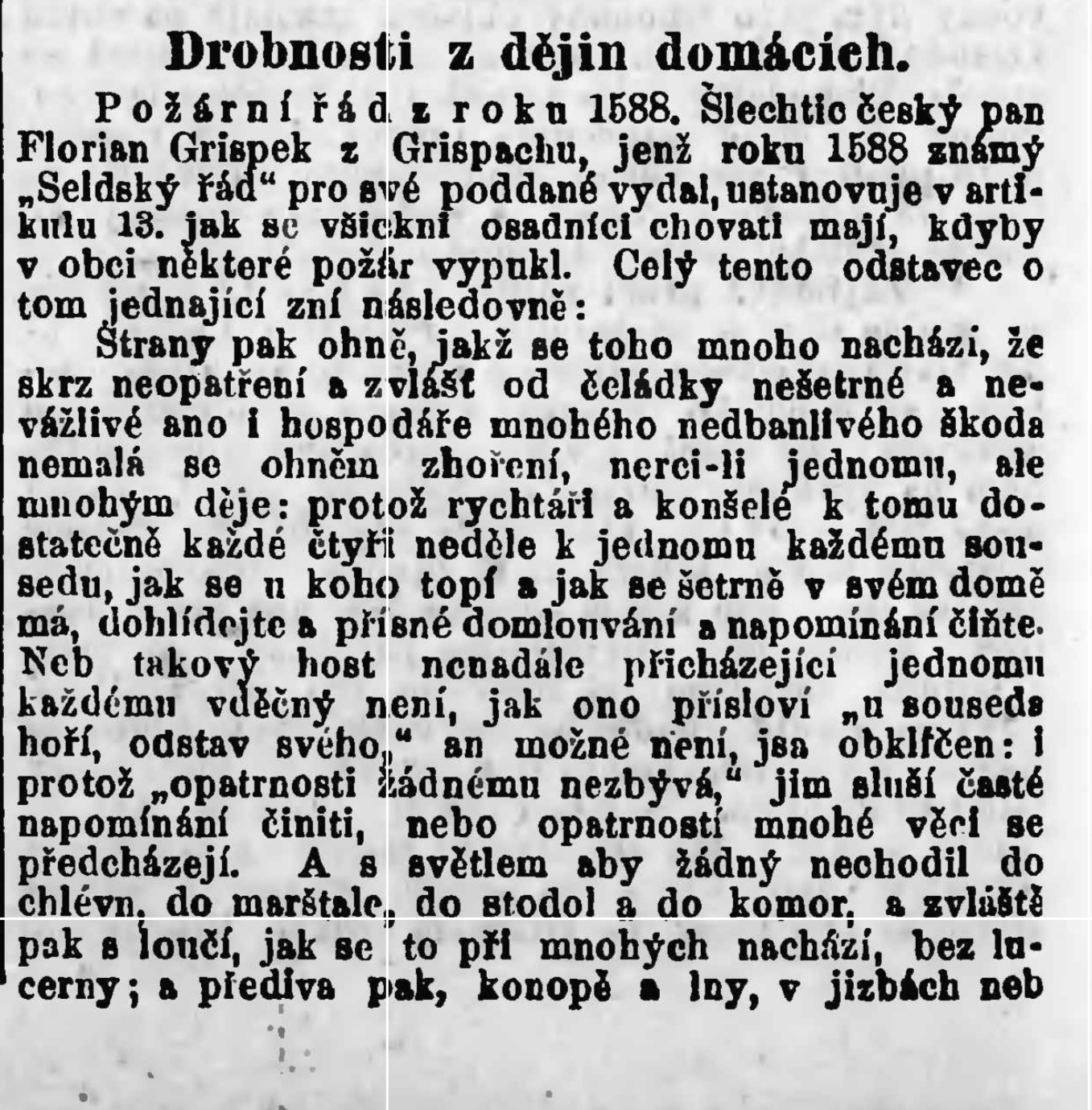 V roce 1588 vydal český šlechtic Florian Griespek z Griespachu významný “Selský řád”, který měl zamezit škodám způsobeným požáry. Tento dokument obsahoval podrobná nařízení o tom, jak se chovat v případě vypuknutí požáru a jak předcházet nebezpečí. Pravidla zahrnovala opatření nejen proti neopatrnému zacházení s ohněm, ale také přikazovala pravidelné inspekce, během kterých rychtáři a konšelé kontrolovali domácnosti.