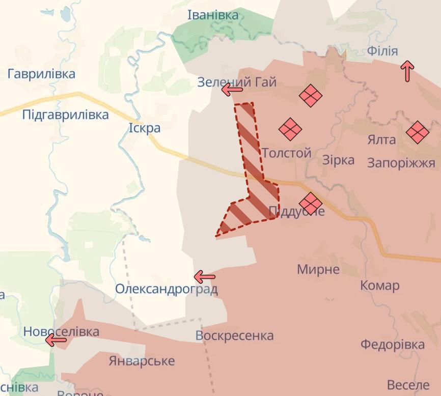 Podle něj ruské jednotky v současné době soustředí své hlavní úsilí západně a jihozápadně od Guljajpole. Zde pokračují v útocích podél silnice Guljajpole-Omelnik a ve směru Dorožňanka-Guljajpole. Během uplynulého týdne byly postupy mírné – v průměru 1–1,5 kilometru – ale ruským jednotkám se podařilo zapojit do bojů o Železnodorožnoje a západně od tohoto města již byly zjištěny jednotlivé útočné skupiny. Tvrdé boje pokračují i v západní části samotného Guljajpole.